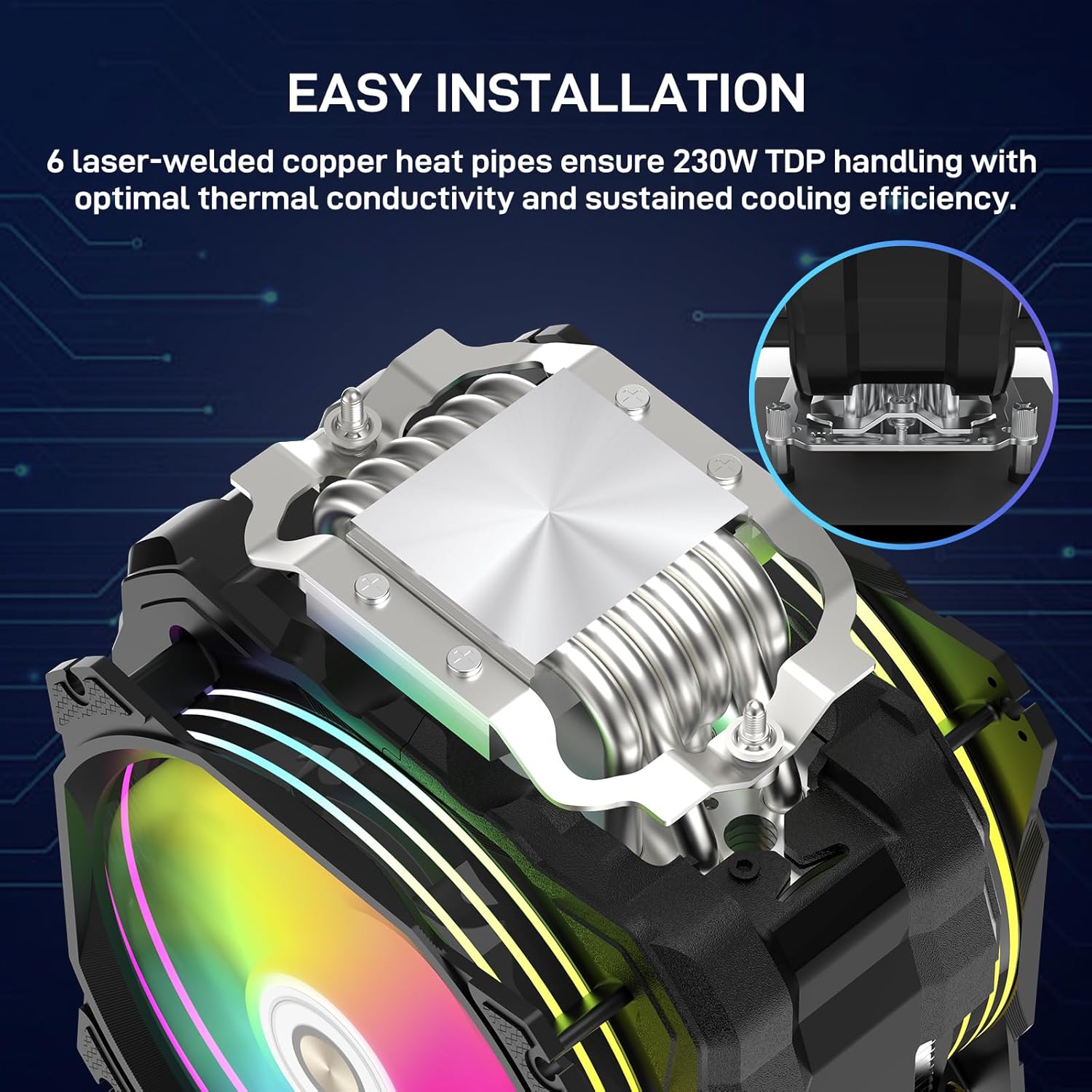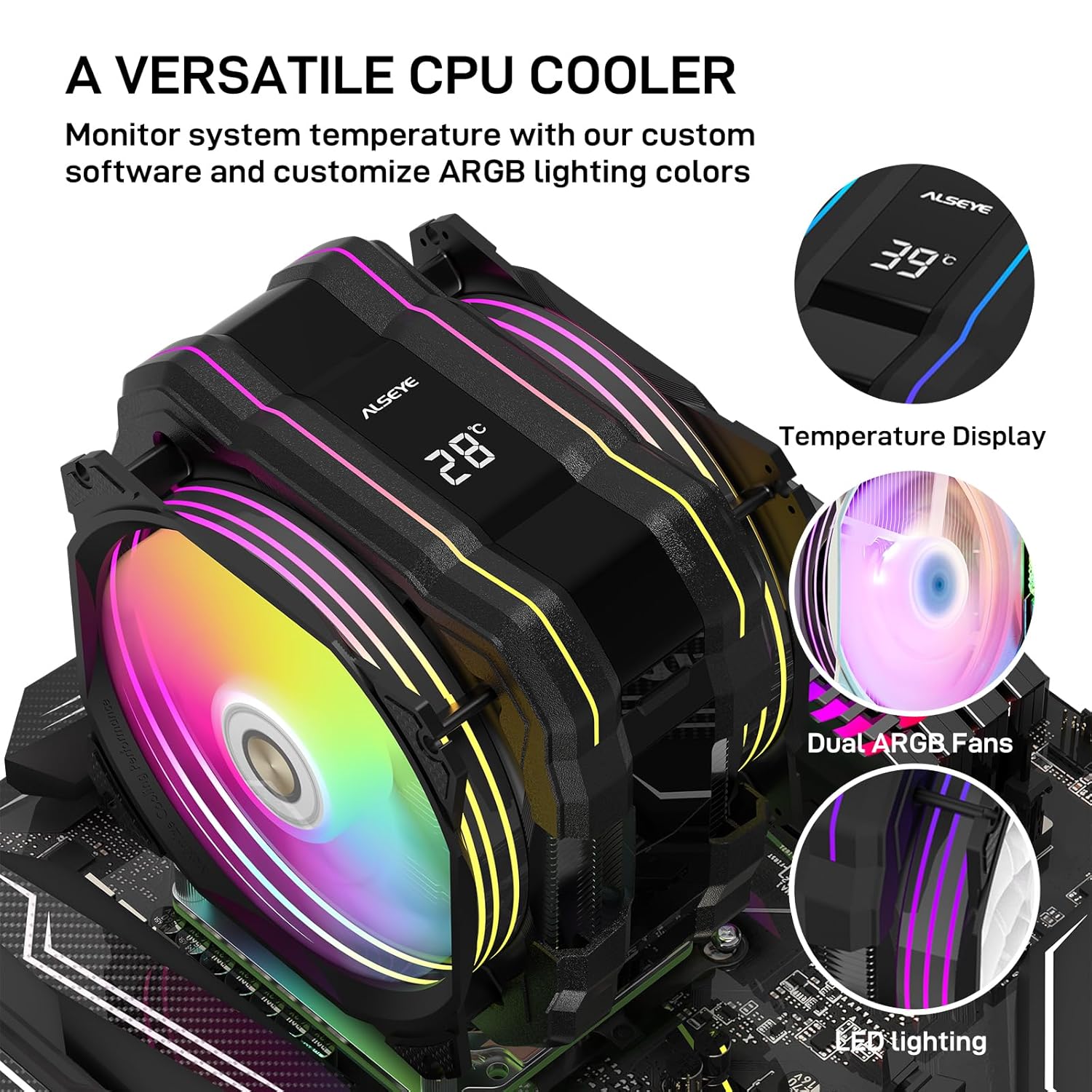 Exceptional Cooling Power: Experience superior cooling with the ALSEYE CPU cooler, featuring a powerful 120mm dual-fan setup with PWM speed control. This advanced design ensures optimal airflow and efficient heat dissipation, while six copper heat pipes and a copper base enhance thermal transfer, keeping your CPU temperatures under control even during demanding tasks.