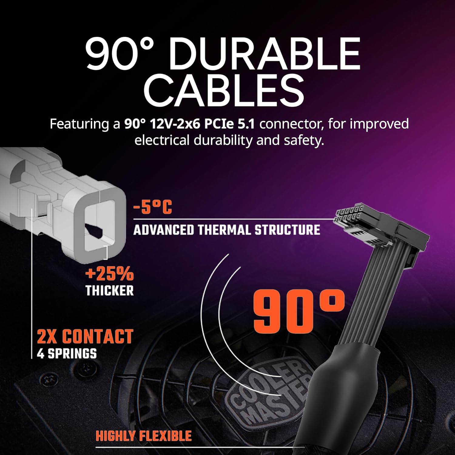 90° Durable Cables: Featuring a 90° 12V-2×6 PCIe 5.1 connector, for improved electrical durability and safety.