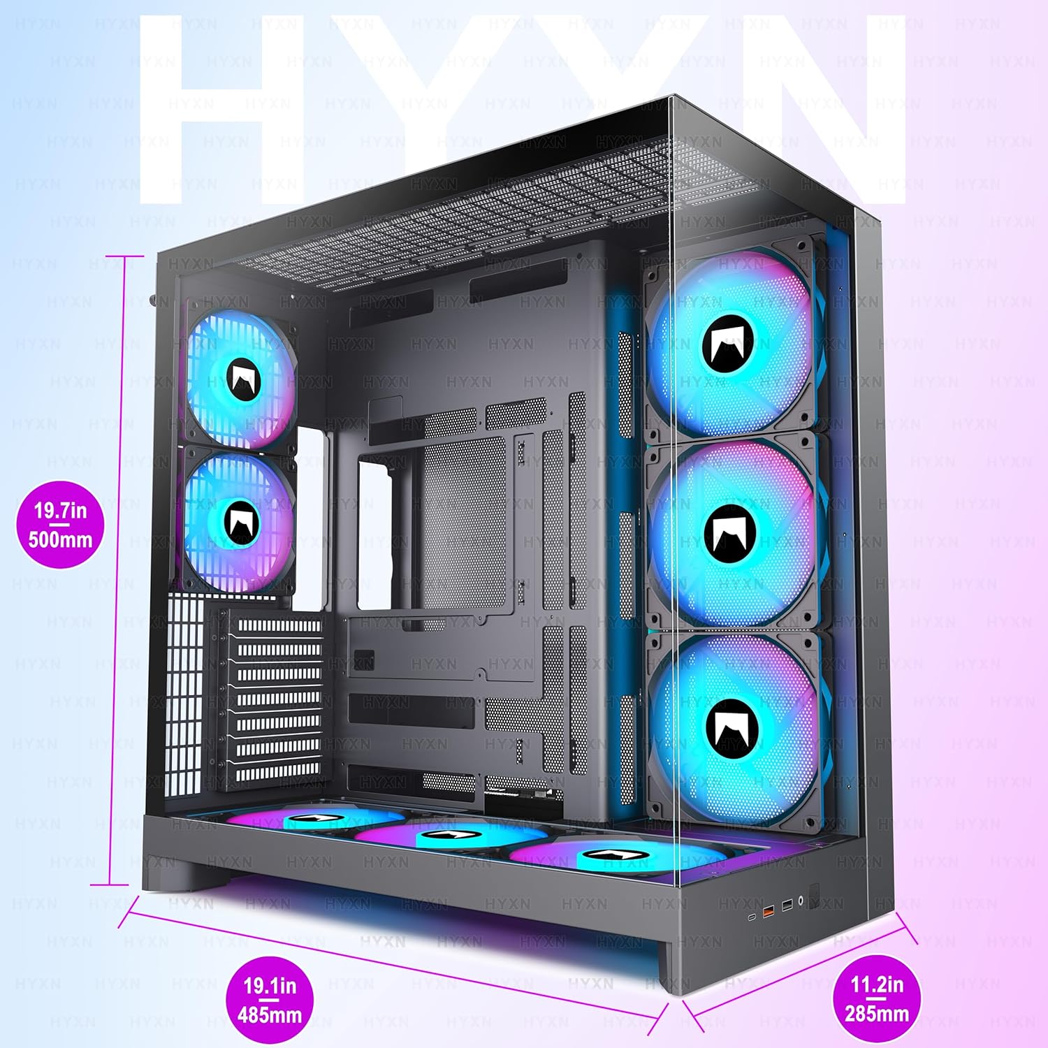 E-ATX/ATX/M-ATX/ITX motherboards, supports GPUs up to 455mm (17.91 inches), accommodates PSUs up to 220mm (8.66 inches), supports 2xHDD and 3xSSD, compatible with back-mounted motherboards, (Dimensions: 500*285*485mm/19.7”* 11.2“*19.1”)