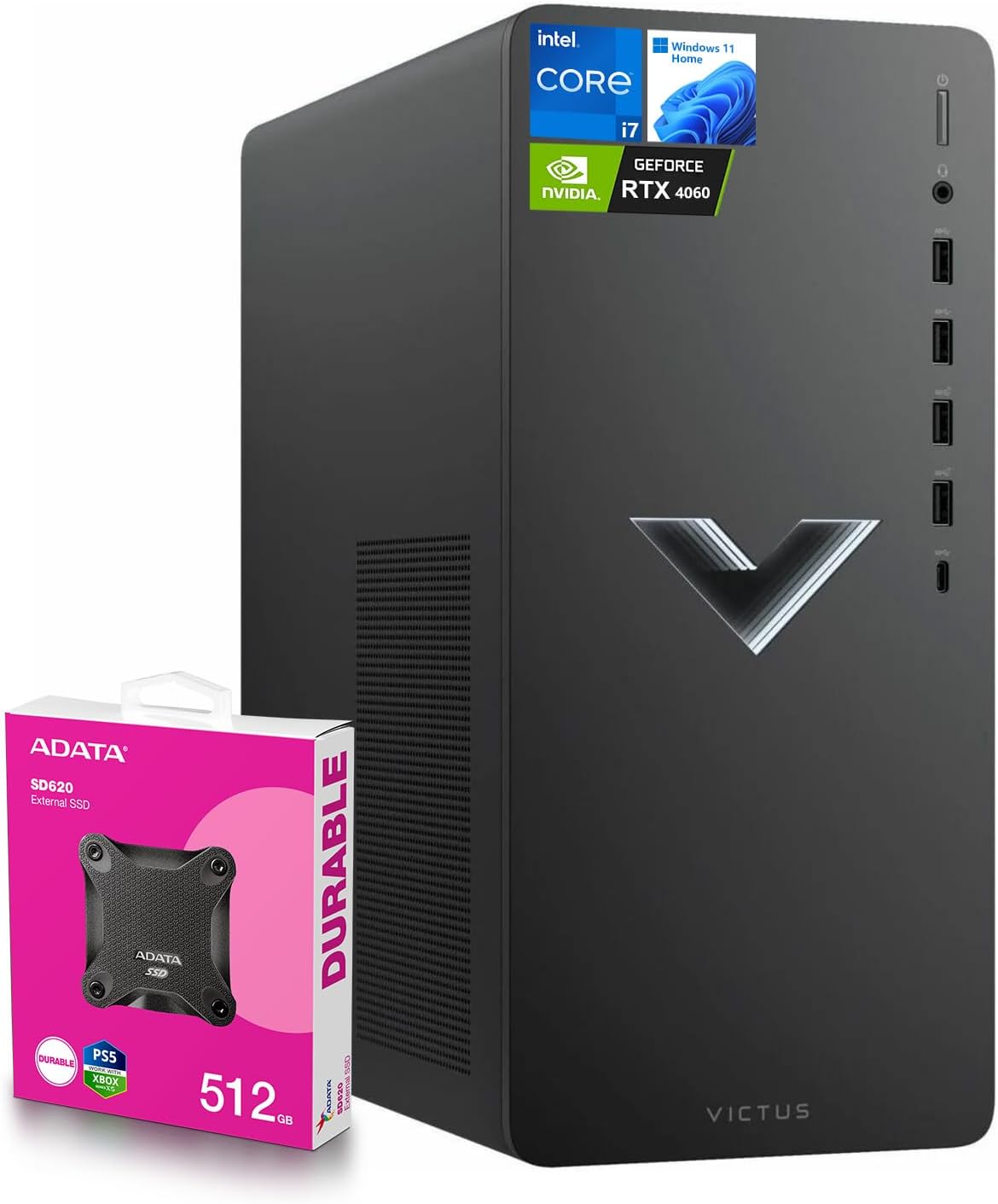 HP Victus 15L VR-Ready TG02 Gaming Desktop, Intel i7-14700F, NVIDIA GeForce RTX 4060, 64GB RAM, 4TB SSD, RJ-45, DisplayPort, Wi-Fi 6, Windows 11 Home, Mica Silver, Bundle with ADATA 512 External SSD