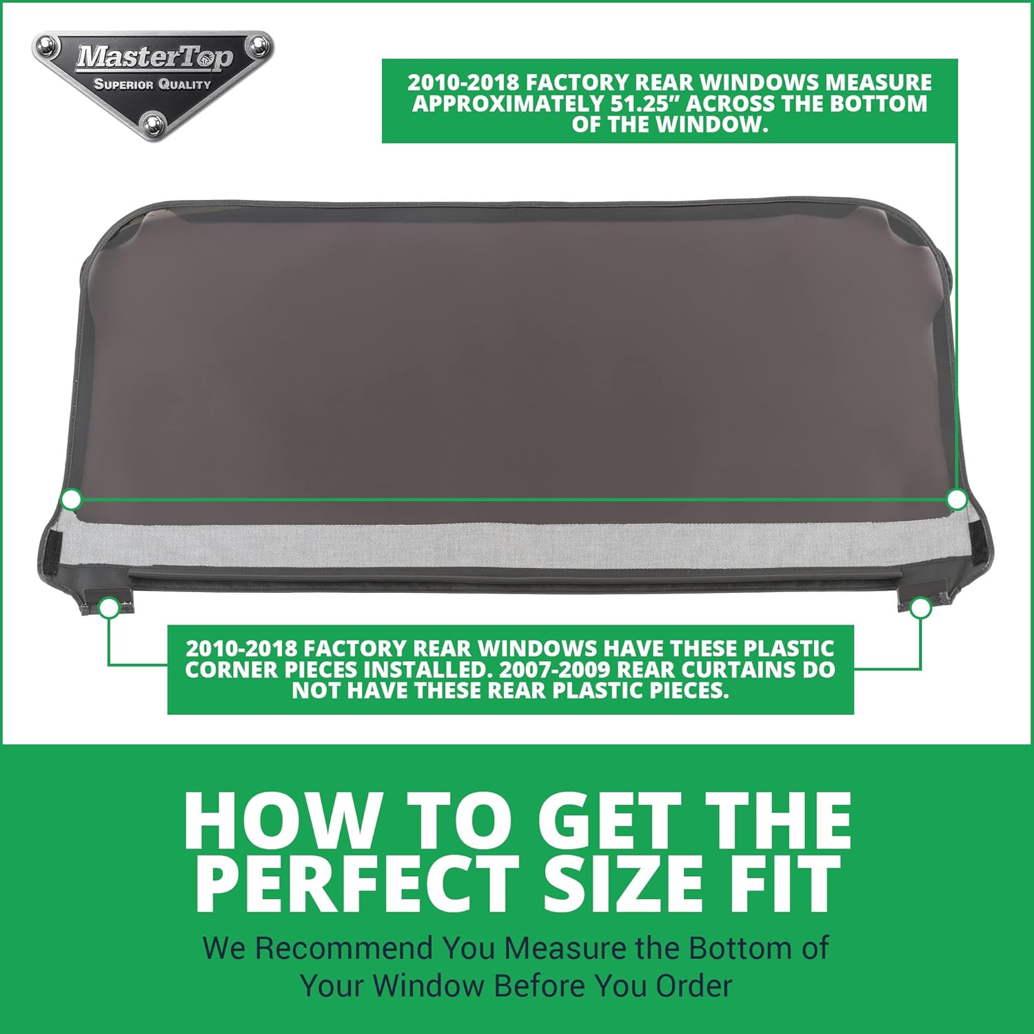 MEASURE BEFORE ORDERING – soft top rear windows will only work with Original Factory Soft Tops. Before ordering, measure the bottom of your current window for the right size. It measures 44.5″ on 2007-2009 models and 51.25” on 2010-2018 models