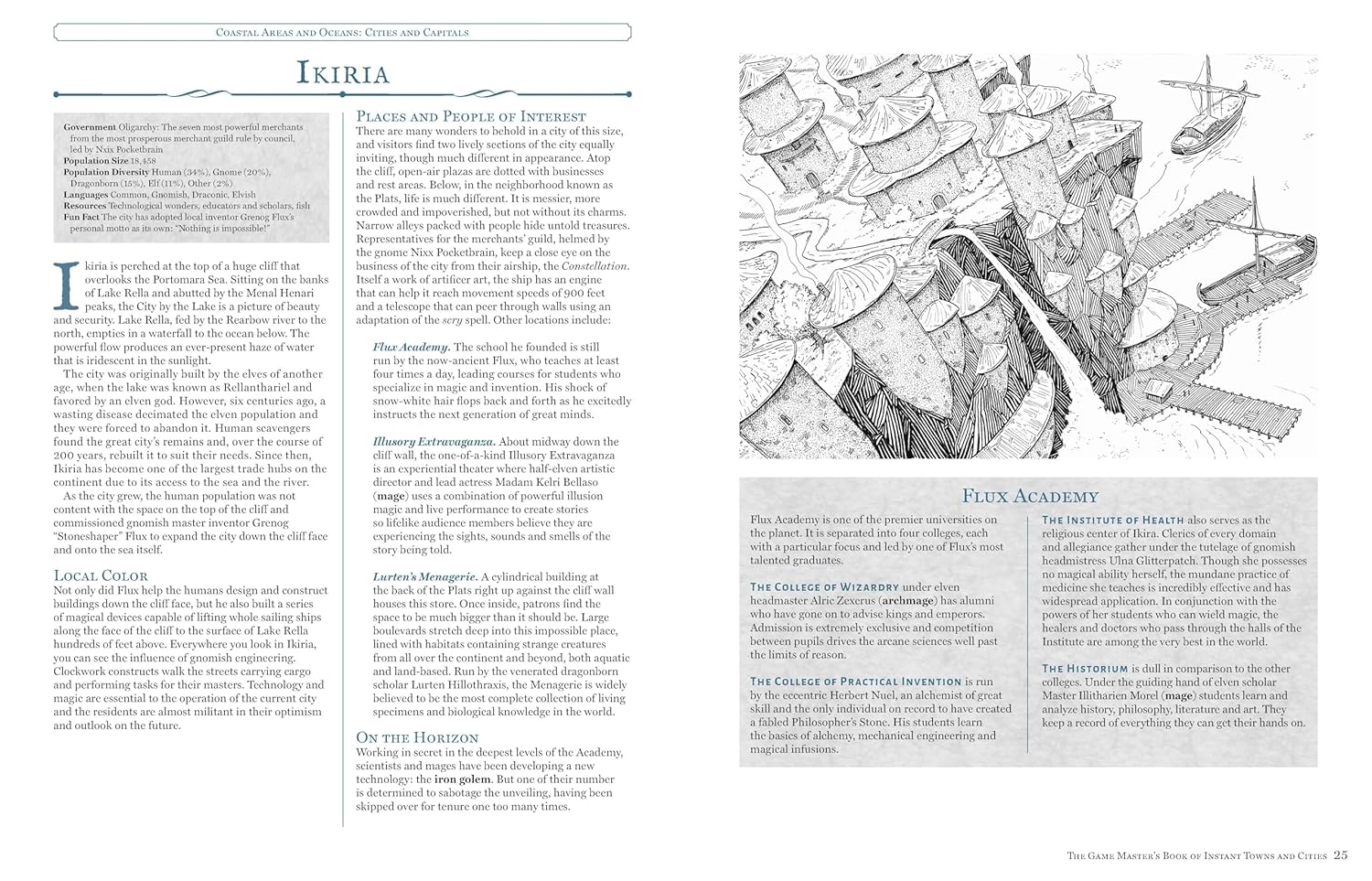 This game-saving collection brings together nearly 170 fully-realized places organized by environment and divided up into villages, towns, cities and capitals, so that when players are trudging through a dangerous swamp, unrelenting desert or stormy coastline and need to find shelter, they can stumble upon a fully realized settlement, elven enclave or dwarven mining camp, without requiring any development in advance on the part of the game master.